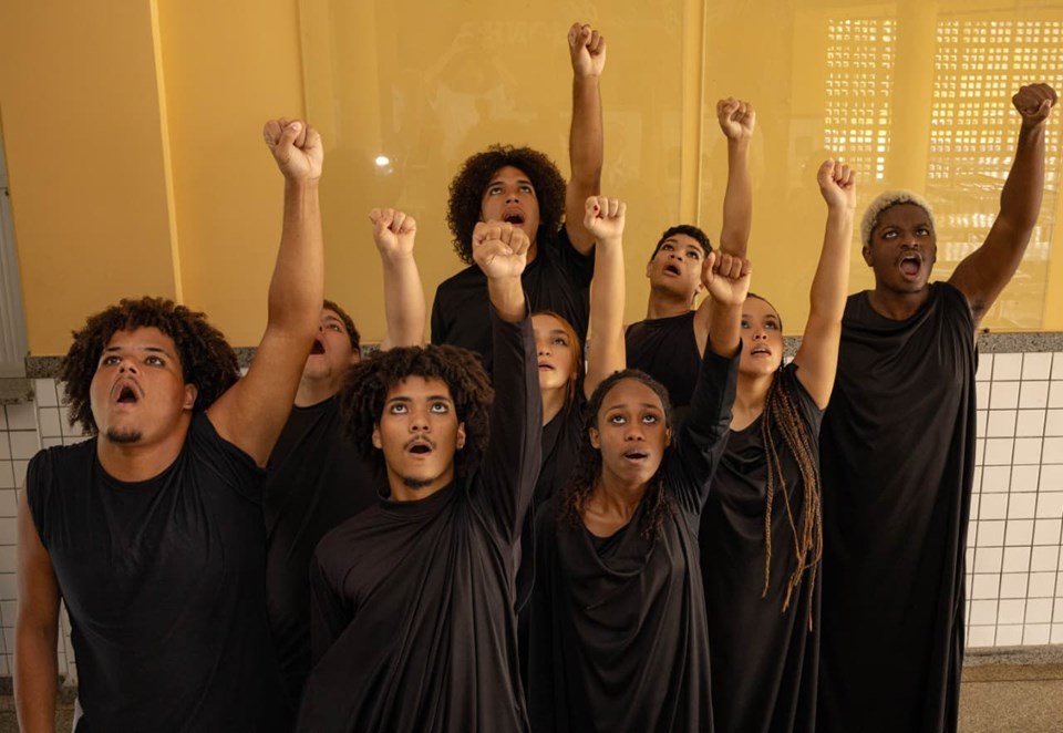 A encenação aposta em elementos corporais e performativos. O grupo utiliza movimentos, composições cênicas e poesia falada no estilo slam.