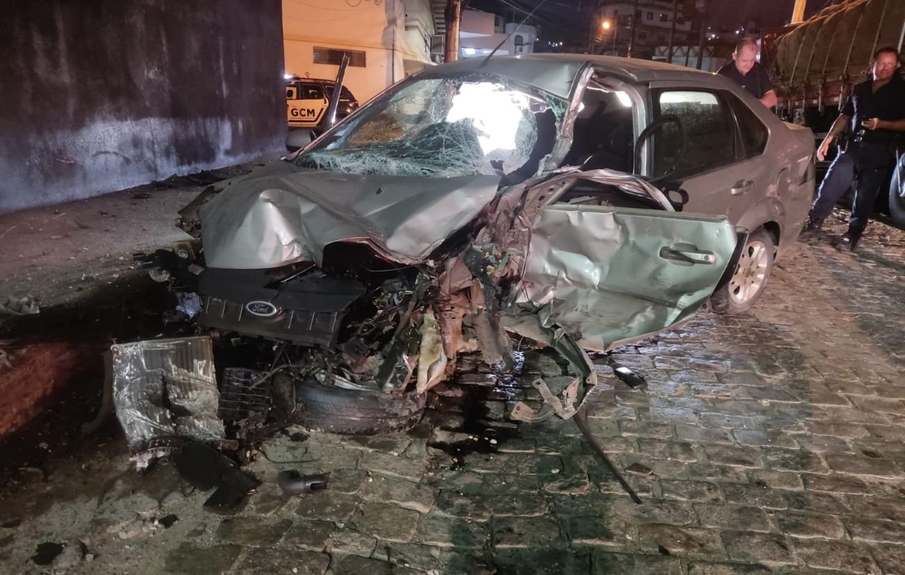 Dois homens bateram o carro ao tentar escapar da Guarda Municipal de Cachoeiro. O veículo – um Ford Fiesta Sedan prata, com restrição por furto e roubo – foi flagrado pelo cerco eletrônico, na madrugada deste domingo (23), no bairro Nova Brasília.