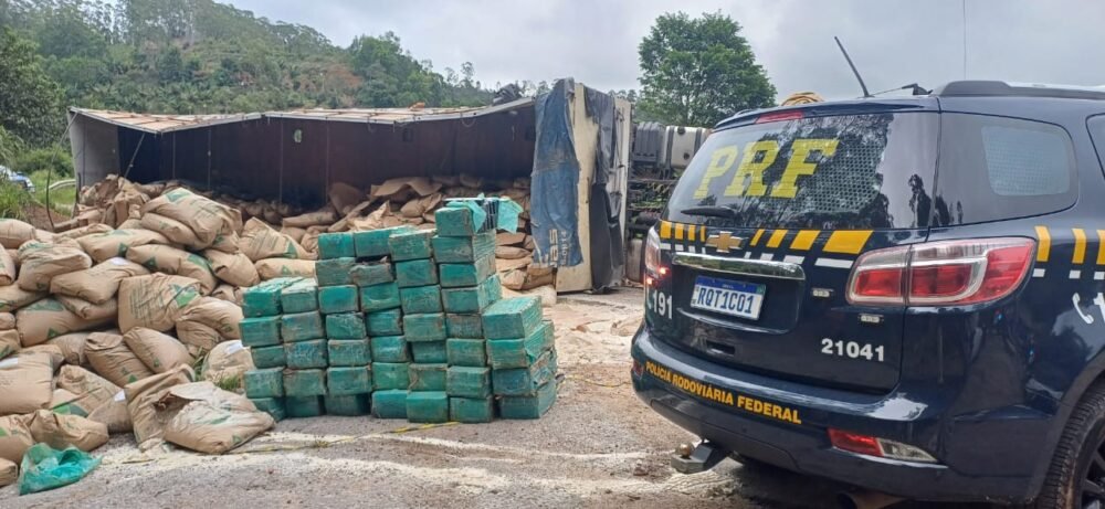A carreta, um modelo Mercedes-Benz Actros, perdeu o controle e tombou, espalhando parte da carga. No momento da inspeção, a equipe da PRF, com apoio da Polícia Militar, identificou os pacotes suspeitos misturados ao carregamento.