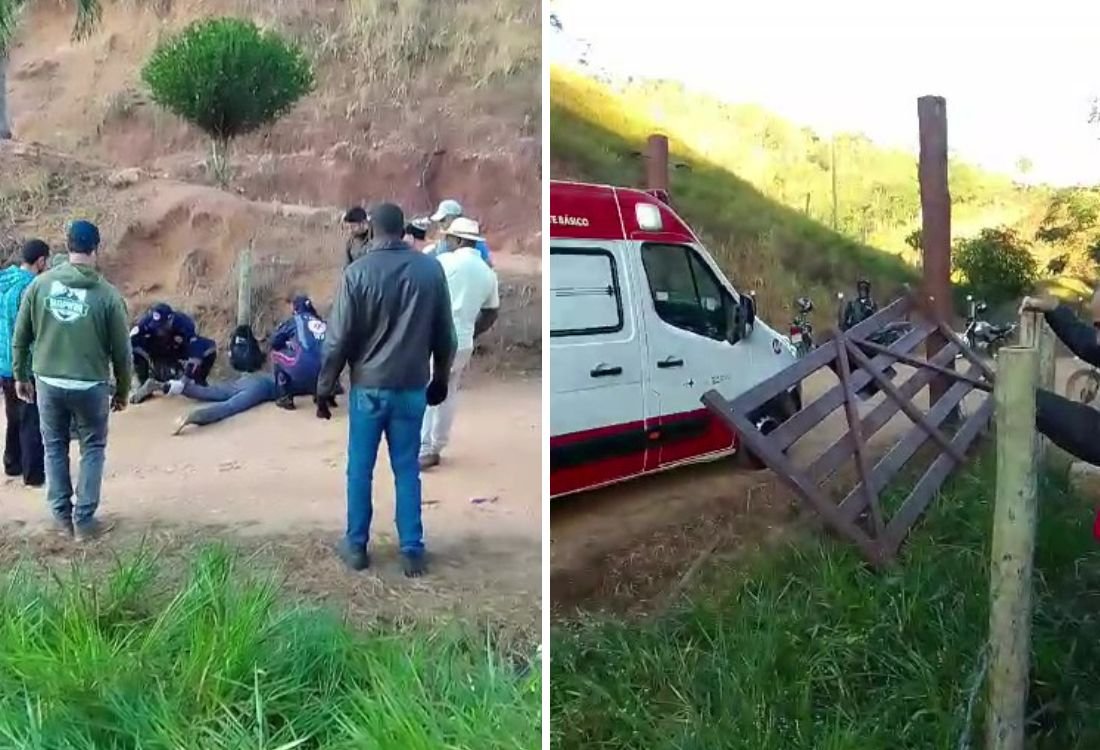 Dois homens foram socorridos na manhã desta terça-feira (27) após caírem de moto em Mimoso do Sul e arrebentarem a porteira de madeira de uma propriedade rural.