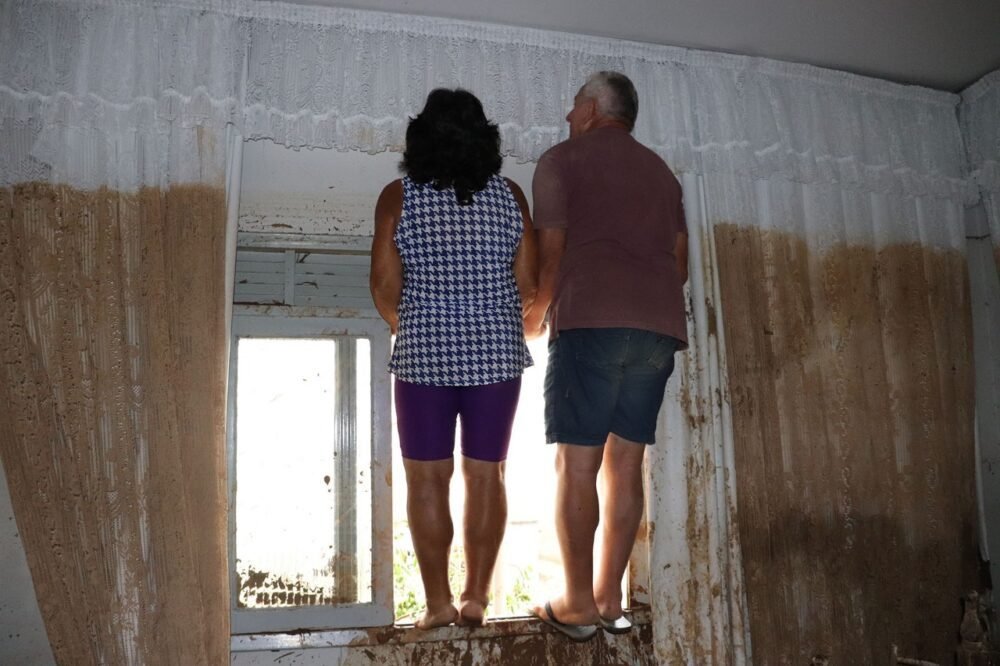 “Eu já não estava aguentando respirar. Estava nas pontas dos pés e a cabeça para cima, procurando ar”, contou Glorinha. As marcas da enchente estão nas cortinas do cômodo: para a água atingir o teto, faltaram apenas 30 centímetros.