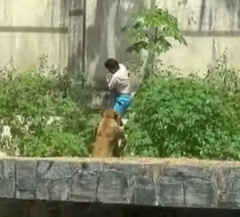 Imagens registradas por visitantes mostram o momento em que ele desce por uma árvore interna e é atacado pela leoa.