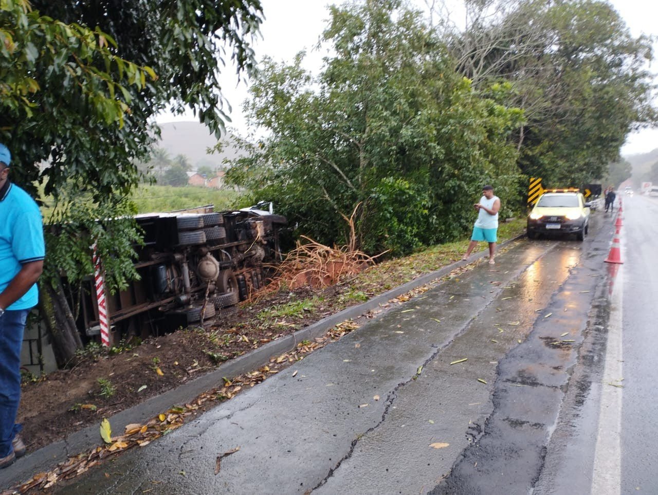 Um caminhão que transportava carga de eletrodomésticos foi saqueado por populares após tombar na manhã desta quinta-feira (20) na BR 101, em Mimoso do Sul.
